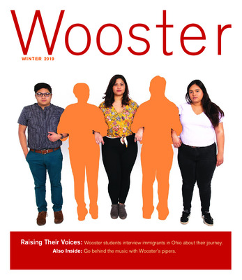 The cover feature of the winter 2019 issue of Wooster magazine features three students who worked with Michele Leiby, associate professor of political science and Latin American studies to interview immigrants in Ohio. Students quoted include Natalia Parra '21, Alexis Sotelo '21, and Lizbeth Acevedo '21, and Alvaro Corral, Perry-Williams Postdoctoral Fellow in Political Science also shared his perspective on the project. Also featured in this issue are the Wooster Pipers highlighting students Ana Fairbanks-Mahnke '20 and Kate Runciman '22, and alumnus and instructor Palmer Shonk '10. The third feature highlights three student's reactions to Williams Hall: Kaeli Zoretich '19, Michael Crookshanks '19, and Jesse Garrett-Larsen '19.