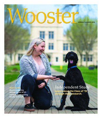 The spring/summer 2019 issue of Wooster reflects a refreshed design including an update Oak Grove section as well as a Tartan Ties section focused on alumni activity and class notes. The news section covers updates to the president's staff, retirements as part of an early retirement incentive program, and a mentoring story featuring David McConnell, professor of Anthropology and Kate Atwell '20. The traditional I.S. issue features seniors Melissa Dods (archaeology & geology), Araam Abboud (classics & biochemistry and molecular biology), Marcus Bowers (psychology), Mallory Crane (English), Jordan Griffith (political science & history), Ellie Howell (archeology), Francisco Martinez (history), Annabelle Hopkins (political science & history), Kia Radovanovic (psychology), and Jeremy Smucker (economics & music). Wooster alumni Sohil Parekh '99, Hayet Rida '11, Rachel Stephenson '96, and Ksenia Klue '18, also share how their I.S. experience continues to impact them today. Tartan Ties includes profiles on Sarah Corney '06, Austin Oberlin '14, and Scot volunteer Christine Farrell '94.